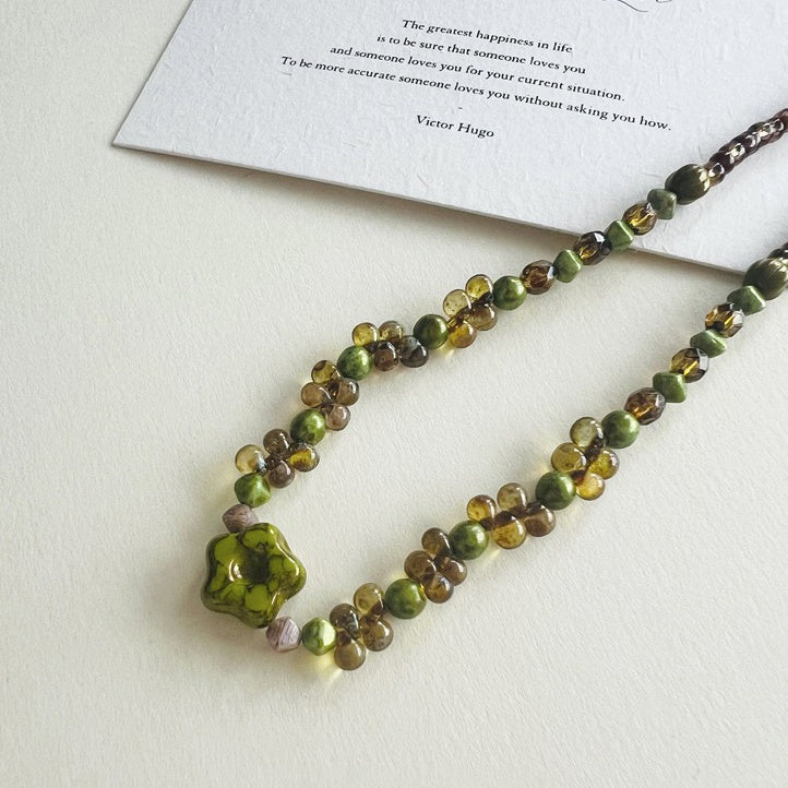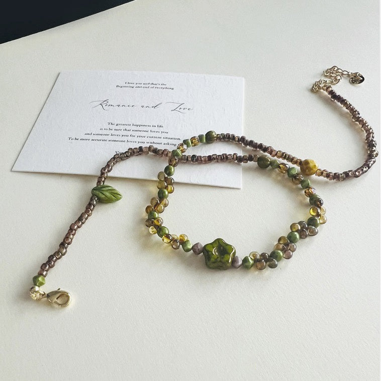 This collection of Czech glass bead jewelry is inspired by the beauty and mystery of forests and plants. The transparent and radiant Czech beads, combined with delicate botanical designs, evoke the fresh essence of a forest. Whether for everyday wear or special occasions, these pieces add a touch of natural elegance and charm to any outfit.